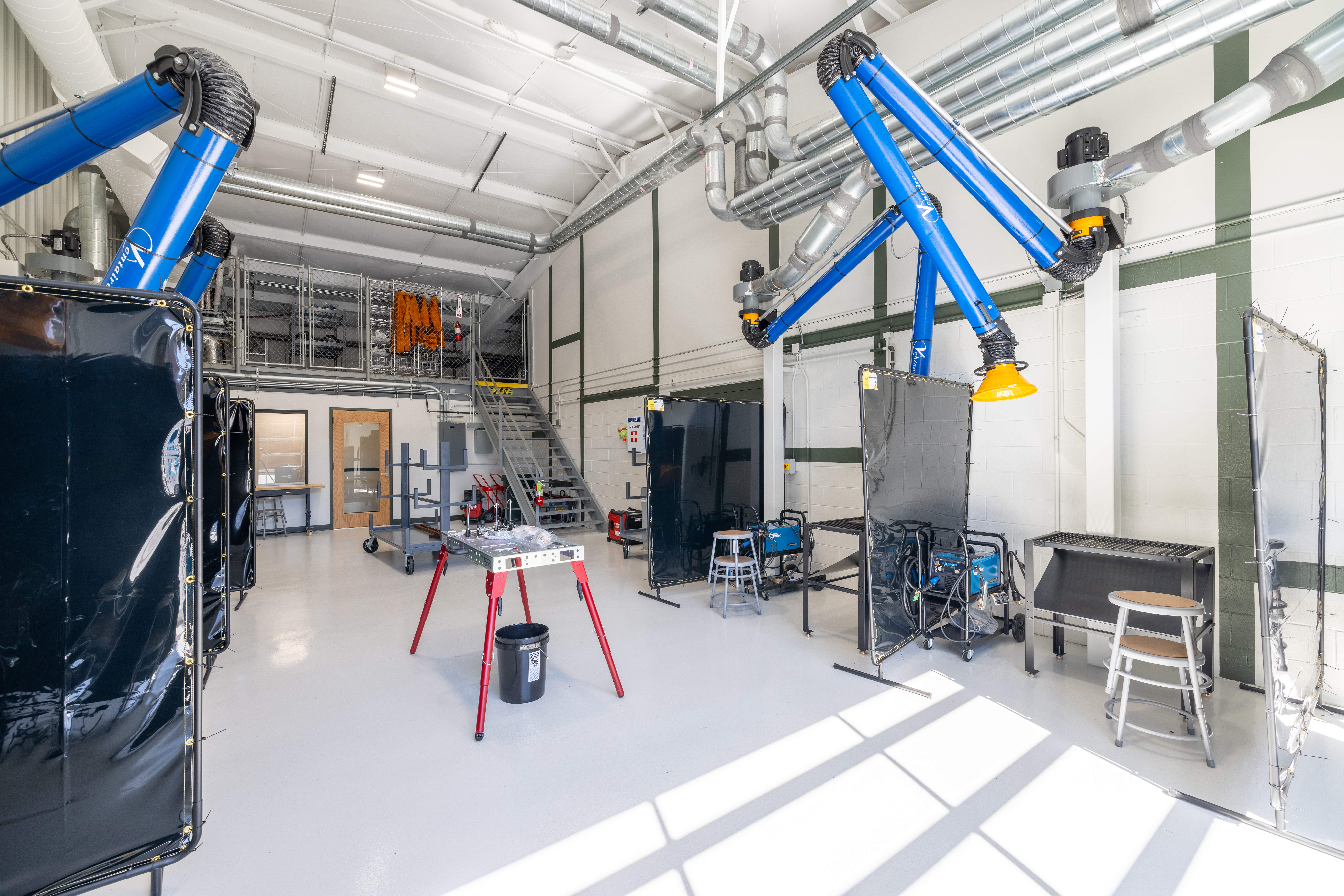 Additionally, the large bays area were converted into state-of-the-art shop classrooms, inspired by the layout of the existing bike repair lab. This lab boasts ample natural light, alongside LED lighting, and advanced welding fume extraction systems. Combined these features create an ideal setting for hands-on learning and experimentation. To enhance outdoor learning experiences, an outdoor fenced area for trail planning and construction was established; complete with a canopy for student interactions. The facility is also equipped with a mezzanine and fenced storage space for trail construction equipment, ensuring that resources are readily available for practical training.